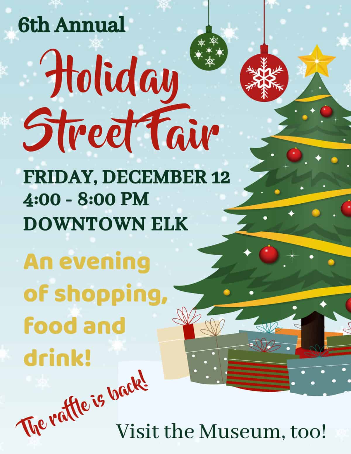 Come enjoy the 6th annual evening of shopping, food, drinks, and holiday cheer in downtown Elk. On Friday December 12th from 4:00 pm to 8:00 pm, businesses are staying open late for a festive holiday evening. By popular request, the free raffle will be back! The Greenwood State Beach Visitor Center/Museum will be open, too! Bundle up and come on out! For more information, contact Becky Powers at Matson Mercantile, MatsonMercantile@gmail.com